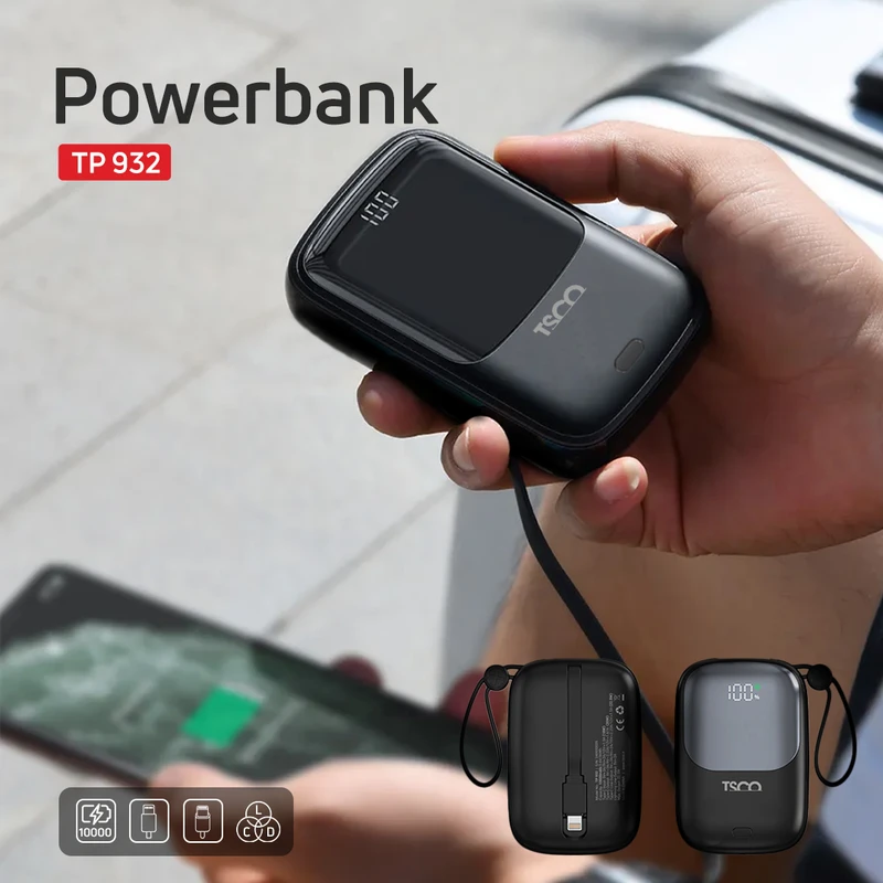 یکی از مهم‌ترین فاکتورها در انتخاب پاوربانک، سرعت و نوع شارژ آن است. پاوربانک تسکو مدل TP932 با پشتیبانی از چندین پروتکل شارژ سریع از جمله QC2.0، QC3.0، PD، PPS، AFC، FCP و SCP، امکان شارژ سریع و ایمن را برای طیف وسیعی از دستگاه‌ها فراهم می‌کند. خروجی لایتنینگ با ولتاژ 5V2A، مناسب برای کاربران دستگاه‌های اپل است. خروجی Type-C Line قابلیت ارائه 5V3A، 9V2A، 10V2.25A و 12V1.5A (22.5 وات) را دارد. خروجی Type-C با ولتاژهای 5V3A، 9V2.22A، 12V1.67A (حداکثر 20 وات) کار می کند. حداکثر توان خروجی این پاوربانک 22.5 وات است که نشان‌دهنده قدرت بالای آن در تأمین انرژی دستگاه‌های مختلف است. باتری لیتیوم-یونی 10000 میلی‌آمپری به‌کاررفته در این پاوربانک، قابلیت حدود 300 چرخه شارژ را دارد. این عدد نشان‌دهنده کیفیت بالای سلول‌های باتری و مدیریت بهینه مصرف انرژی است. پاوربانک TP932 با دارا بودن دو کابل داخلی تایپ C و لایتنینگ، تجربه‌ای راحت را برای کاربران فراهم می‌کند. همچنین، به همراه این پاوربانک، یک کابل USB-A به Type-C (5V2A) نیز ارائه می‌شود که کاربران می‌توانند از آن برای شارژ پاوربانک یا دستگاه‌های دیگر بهره ببرند. بدنه‌ی پاوربانک TP932 از ترکیب پلاستیک فشرده‌ی ABS و پلی‌کربنات (PC) ساخته شده است. این ترکیب نه‌تنها باعث می‌شود پاوربانک استحکام بالایی در برابر ضربه و فشار داشته باشد، بلکه آن را در برابر حرارت و خط‌وخش نیز مقاوم می‌کند.